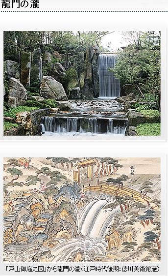 寛文9年(1669年)二代藩主光友の頃に造営が始まった尾張家江戸下屋敷(戸山屋敷)では、当代随一と言われた庭園を有し、園内には「鳴鳳渓」と呼ばれた渓谷を構成する龍門の瀧がありました。鳴鳳渓は、渓流の飛石の上を渡りきると急に龍門の瀧から落ちる水が増して石が水中に没するという趣向が凝らされたもので、当時園遊会に招かれた将軍や諸大名は、大変驚き、また、喜び楽しんだと言われています。